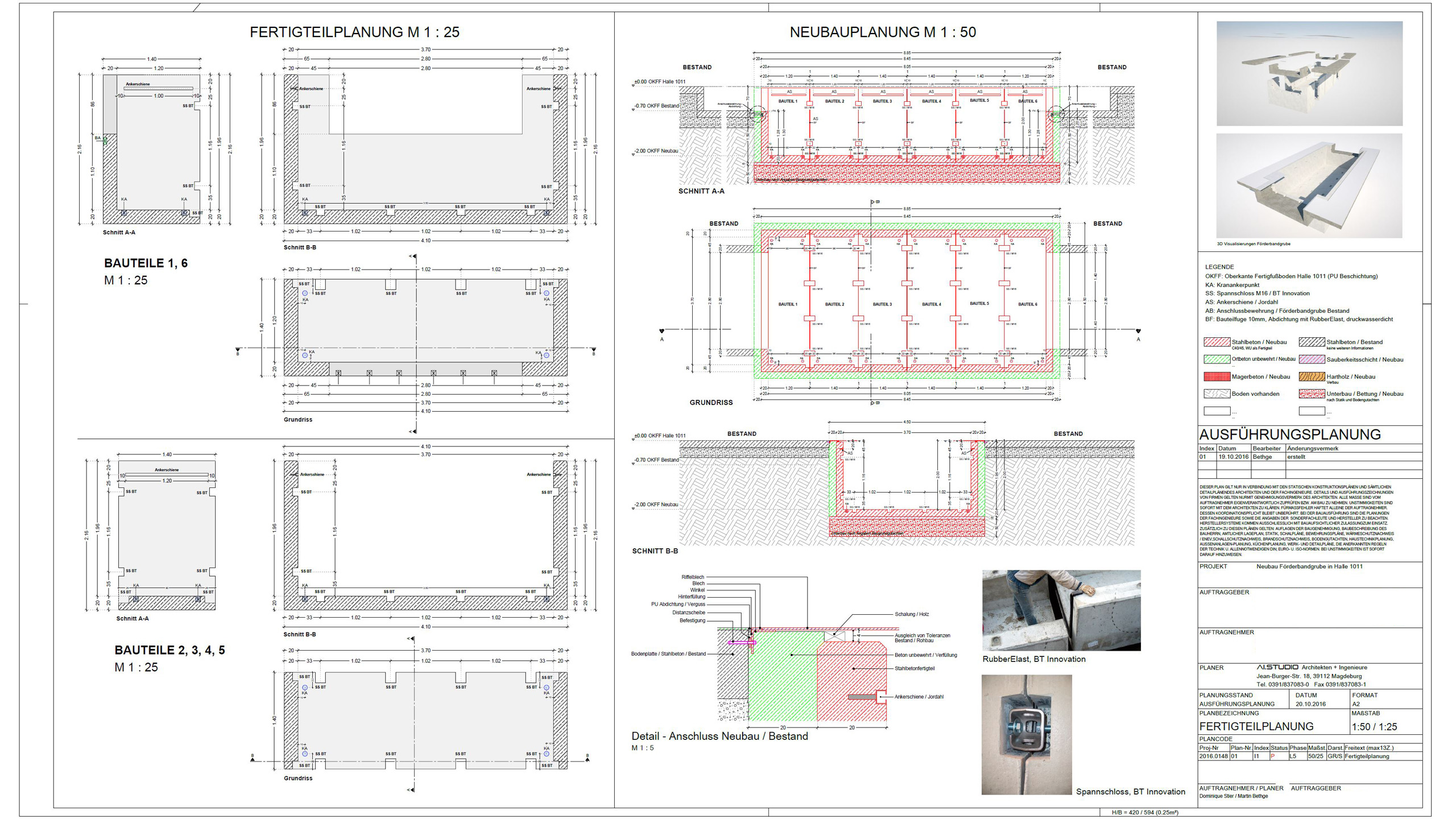 Die Förderbandgrube wurde aus 6 Stahlbetonfertigteilen vorproduziert und anschließend in nur 6 Stunden montiert. Für den gesamten Bauablauf hatten wir nur ein knappes Zeitfenster von 36 Stunden (vom23.12.2016 bis 25.12.2016). Alle geplanten Abläufe haben super funktioniert und die Produktion konnte am 01.01.2017 wieder aufgenommen werden.